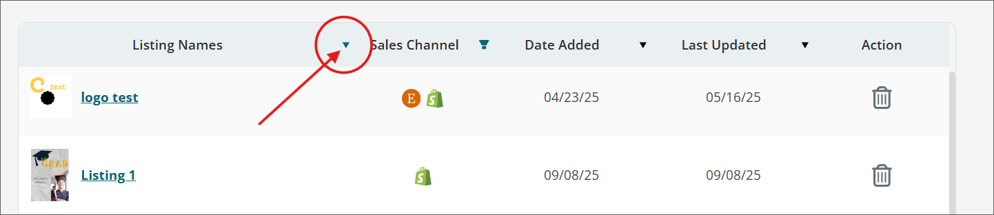 Use the small "triangle" icon button to sort by Listing Name, Dated Added, or Last Updated.