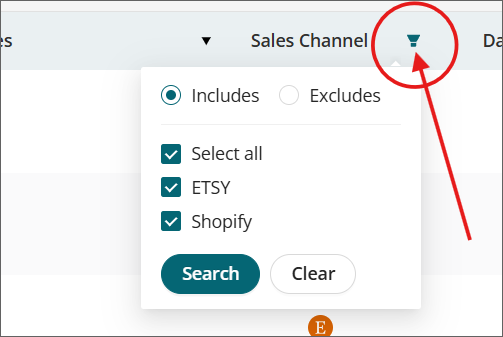 To filter by Sales Channel, click the "filter" icon button next to the Sales Channel name. Use the options in the pop-up box to select the filter options.