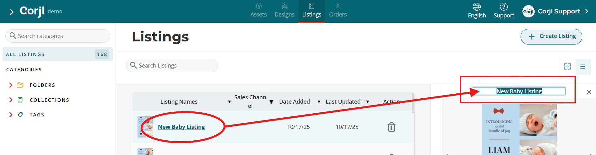 Corjl uses listings to directly match the product listings you will create in your online marketplace. Listings allow you to add multiple designs to the same order, determine which designs will show in the Demo, and use and assign variation options to designs.