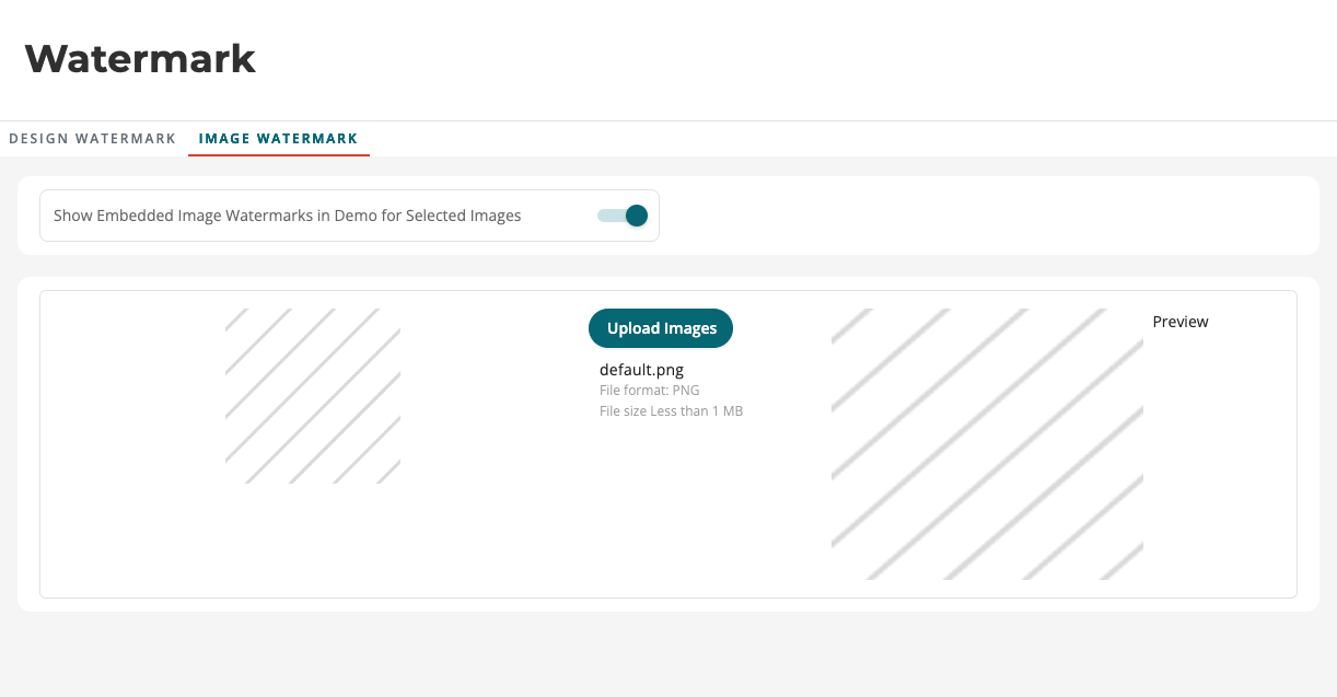 Image Watermark – This option provides an extra layer of protection to images in a design. You can apply the watermark image here to individual images on the Manage tab found in the image’s Details page.