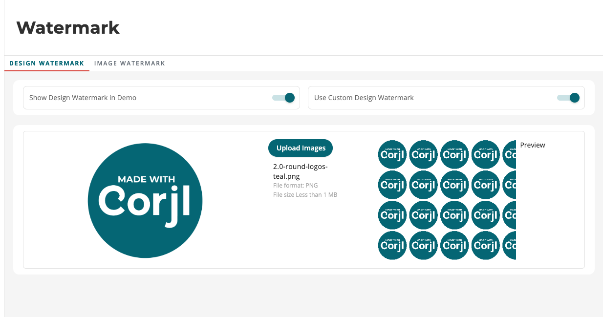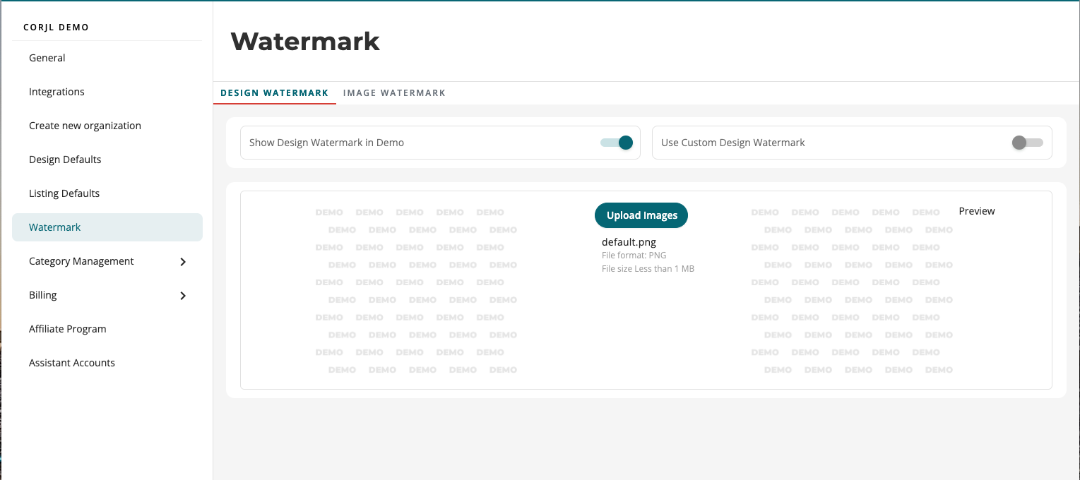 - Show Overlay Watermark – Enable this option to use the default Corjl watermark image in your Demos.