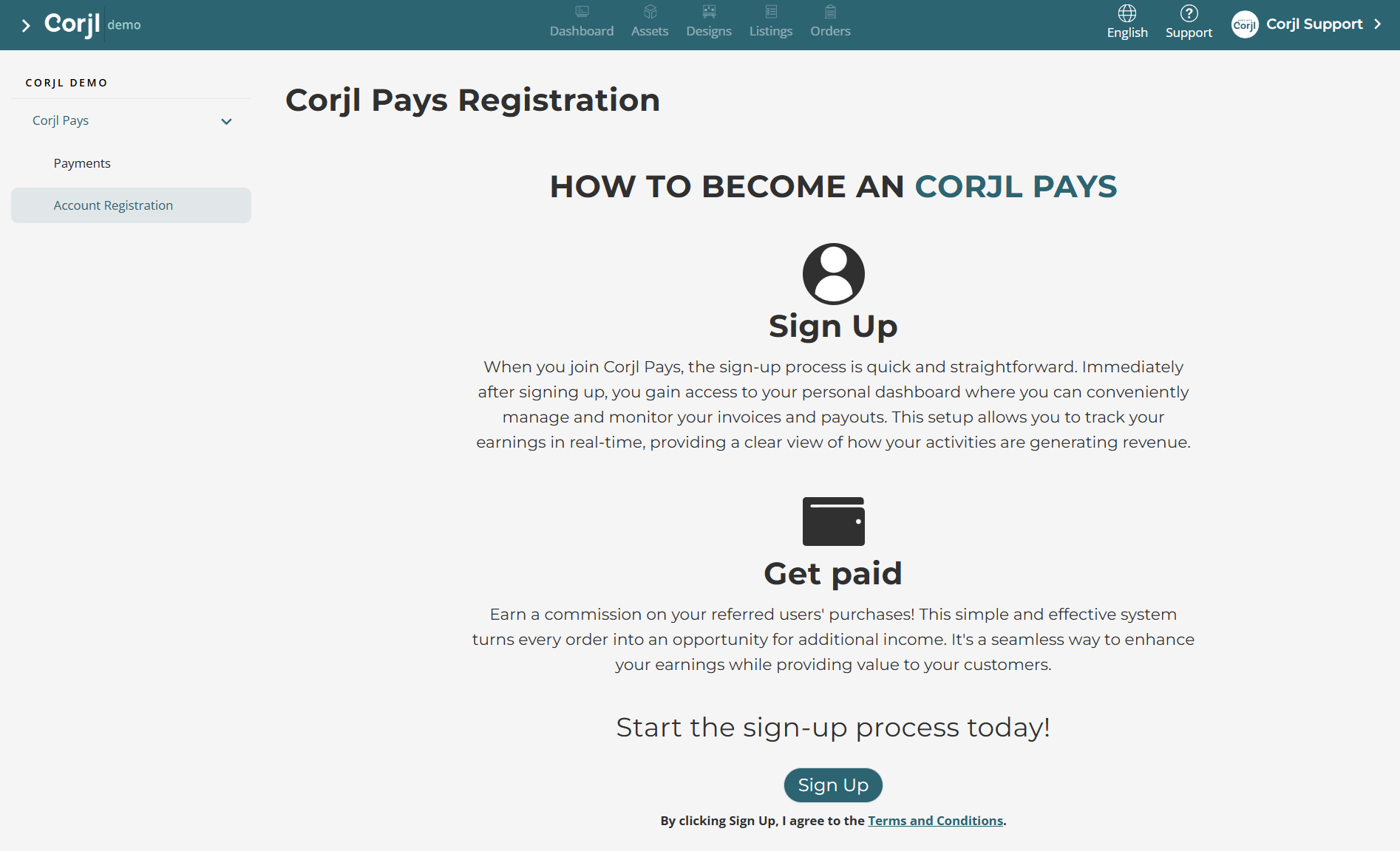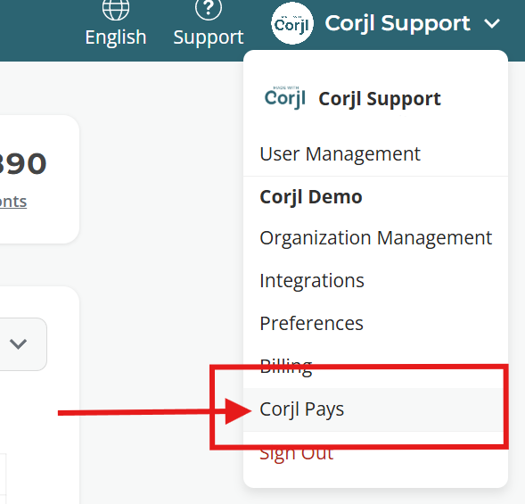 - Select the Corjl Pays option in the Settings drop-down menu.