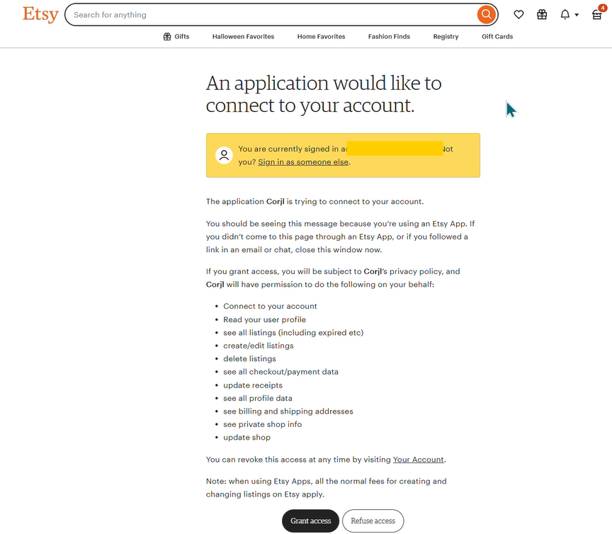 - Etsy will ask you to grant Corjl permission to access your shop.