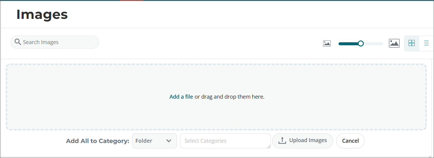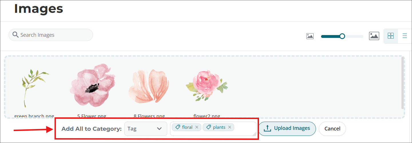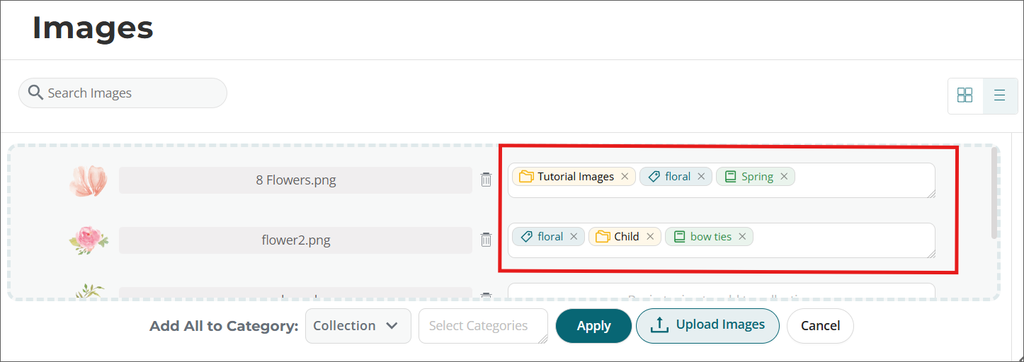 - Thumbnail View allows you to categorize all assets being uploaded as a group.