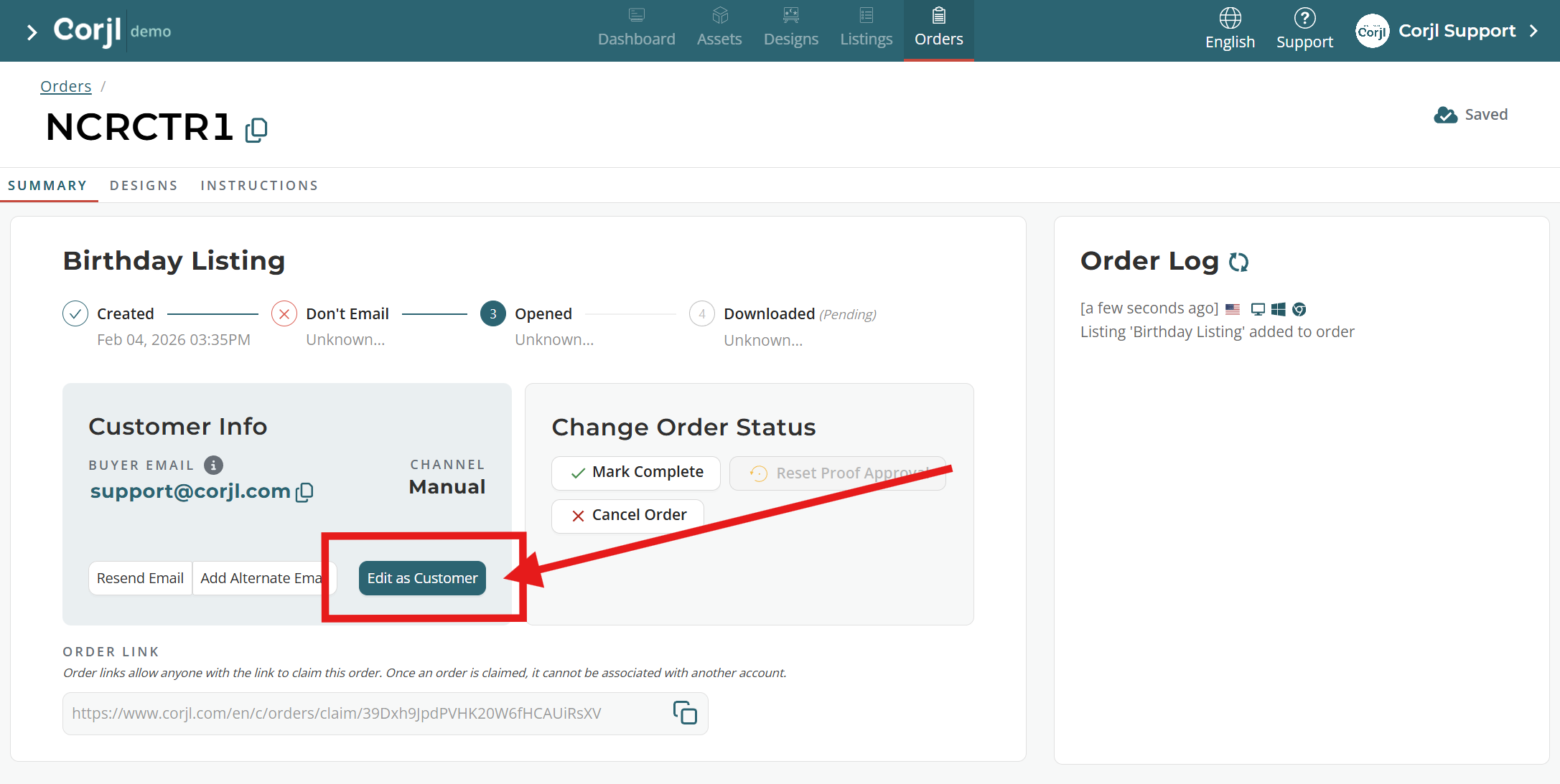 Click on the Edit as Customer button to log into the order.