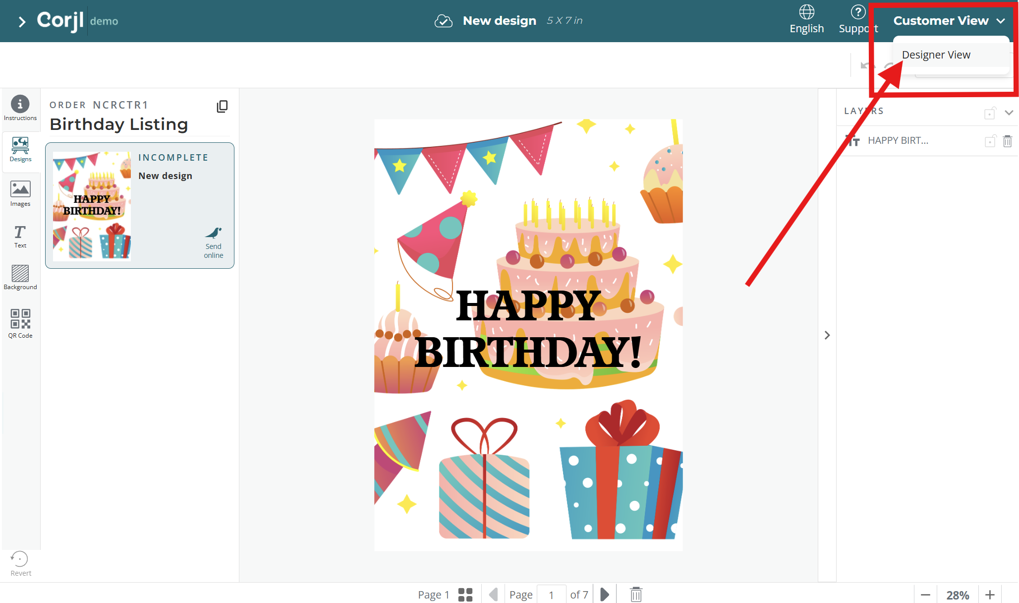 Once in the Designer View for the design, you can make the necessary changes for the customer.