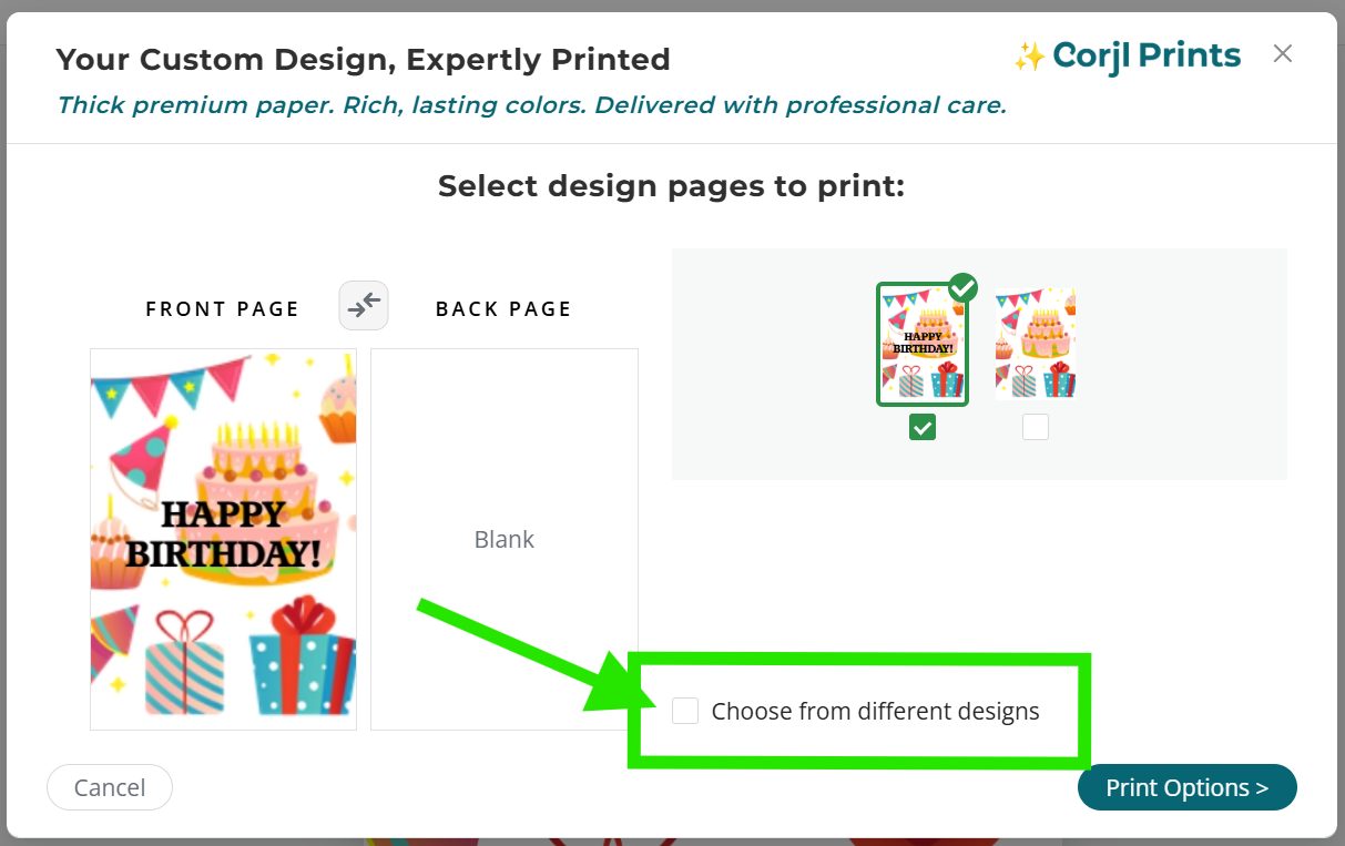 Next, check the box next to the Choose back from different design option found below the page thumbnail images area.