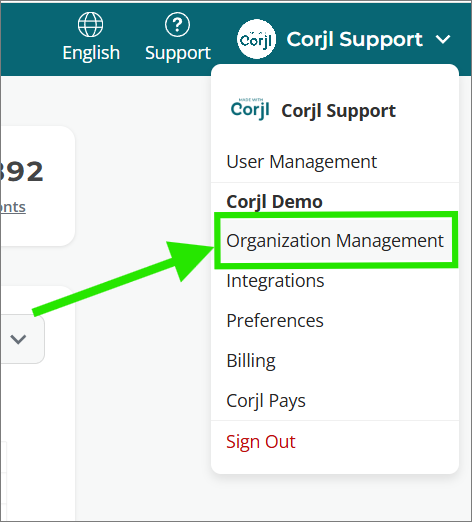 Select the Organization Management option found in your account Settings drop-down in the upper right of your Corjl account: