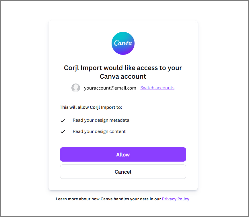 After clicking the Connect to Canva button, you will be directed to Canva to link your account. Click on the Allow button to begin the import: