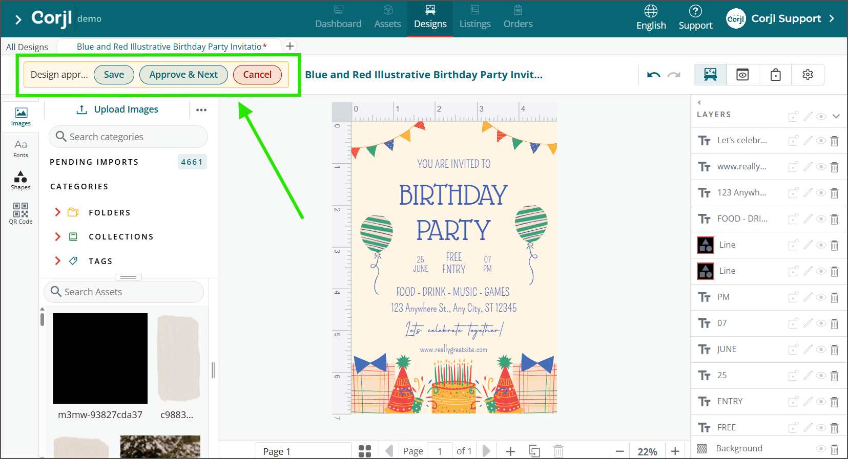 It is important that each design is reviewed and approved before being added to the main Designs area of your Corjl account.